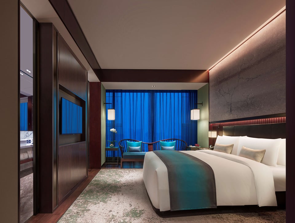 Deluxe Rooms are 41 to 48-square metres in size, in king-sized or twin bed configurations. Located on floors 5 to 12 with a full city or garden view. Bedecked in a soothing palette of cream and celestial blue, each harmonious living space has been conceived with your ultimate comfort in mind, inspired by Ming Dynasty scholar Wen Zhenheng's writings on the “ideal environment for sleep”.